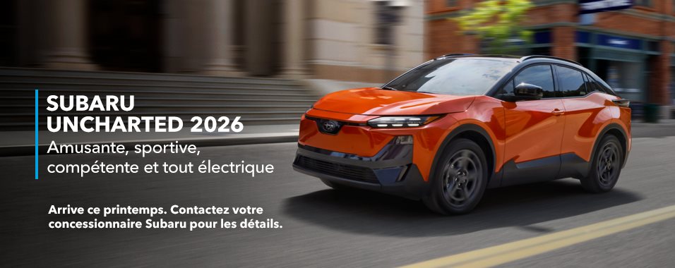 Découvrez la toute nouvelle Subaru Uncharted 2026, le VUS tout électrique qui est aussi à l’aise dans les rues de la ville que lorsqu’il part à la conquête du week‑end. Compact et athlétique, il se montre agile dans la circulation, stable sur l’autoroute et confiant en toutes conditions. Avec une autonomie électrique estimative allant jusqu’à 496 km1,3, la routine quotidienne demeure simple et sans effort, tandis que la recharge rapide en courant continu (CC) permet de récupérer 10 à 80 % en environ 30 minutes² dans des conditions idéales. Pour les conducteurs qui désirent un peu plus de pep, le groupe motopropulseur à deux essieux électriques, disponible en option, développe 338 chevaux et est disponible avec la traction intégrale symétrique à prise constante. Ces systèmes sont appuyés par la fonction X-MODE® bimode disponible et une garde au sol de 208 mm pour un surcroît de confiance hors des sentiers battus. À l’intérieur, l’habitacle raffiné et moderne s’articule autour d’un écran tactile de 14 pouces, avec deux chargeurs de téléphone sans fil et la connectivité SubaruConnectMC. C’est une conduite électrique aussi naturelle qu’amusante, indéniablement signée Subaru.